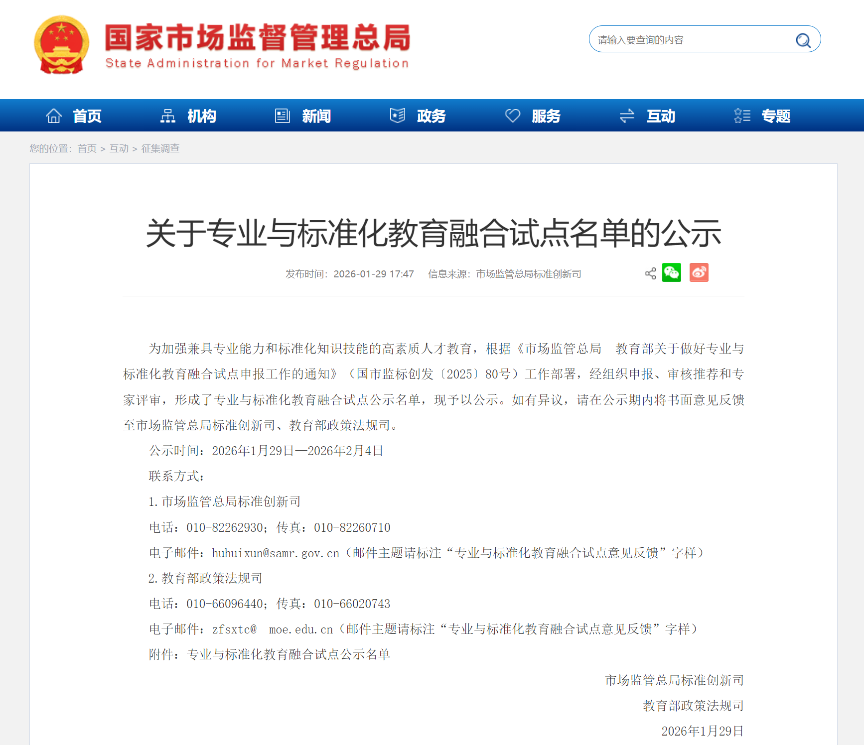 近日,国家市场监督管理总局、教育部联合公布《关于专业与标准化教育融合试点名单的公...