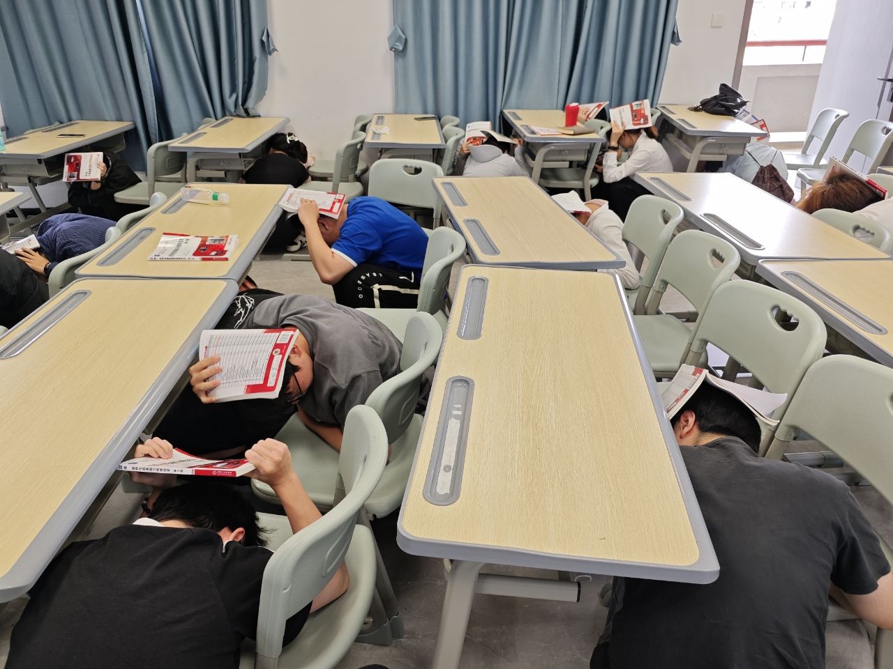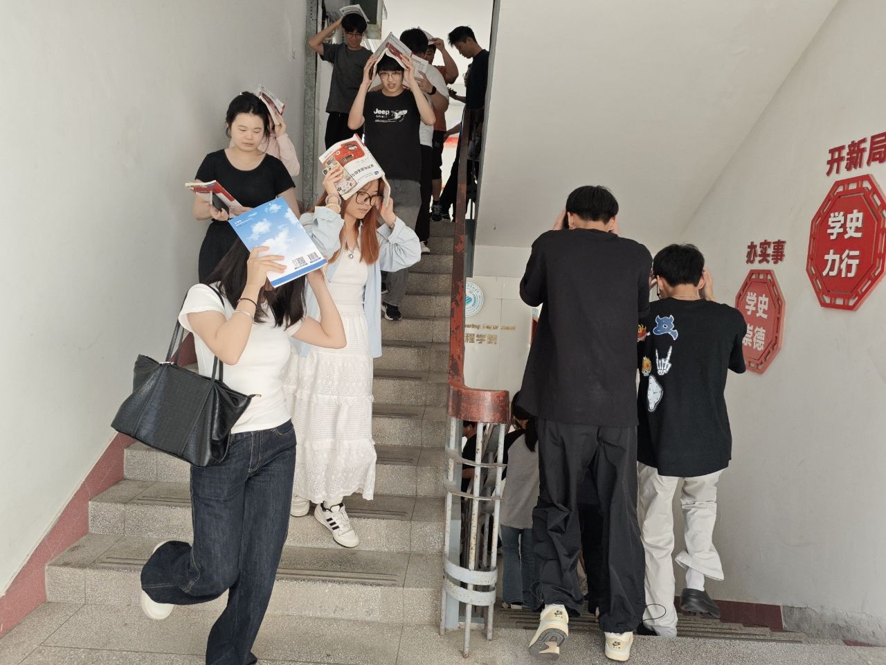 讲座结束后,紧接着开展了紧张而有序的地震应急演练。随着一声急促的模拟警报声骤然响起,参与演练的师生们迅速进入应急状态,按照防震避震“蹲下、抱头、抓牢”的口诀,迅速原地蹲下抱头,就近躲避在课桌或会议桌下,以躲避地震初期的强烈震动。当警报解除后,学院广播立即循环播放疏散信号,所有师生迅速反应,按照预先规划好的疏散路线,弯腰、护头,有序、快速地撤离至操场集合。在整个演练过程中,各班级、各部门紧密配合,师生们行动迅速、秩序井然,从警报响起至全体人员安全撤离至操场并完成人数清点,整个过程仅耗时约3分钟,充分展现了学院师生高效的应急反应能力和良好的组织纪律性。