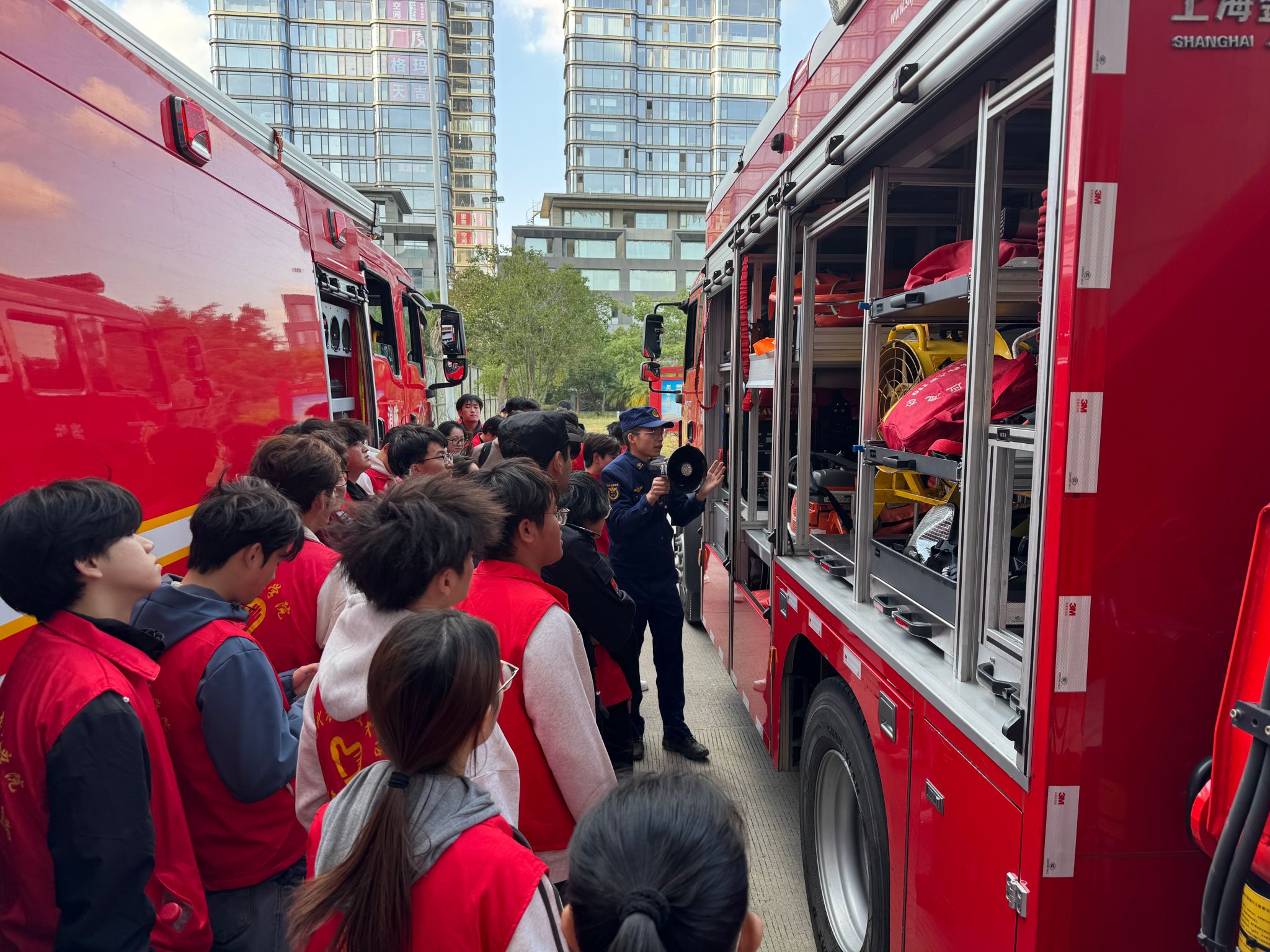 在装备展示环节,消防战士引导师生参观了大队各类先进的特种救援装备。从功能齐全的抢险救援车、高大威猛的云梯消防车,到精密的液压剪扩器、水下探测机器人等,丰富的装备种类和消防员的现场操作演示,让师生们对消防救援的科技化、专业化水平有了直观深入的了解。