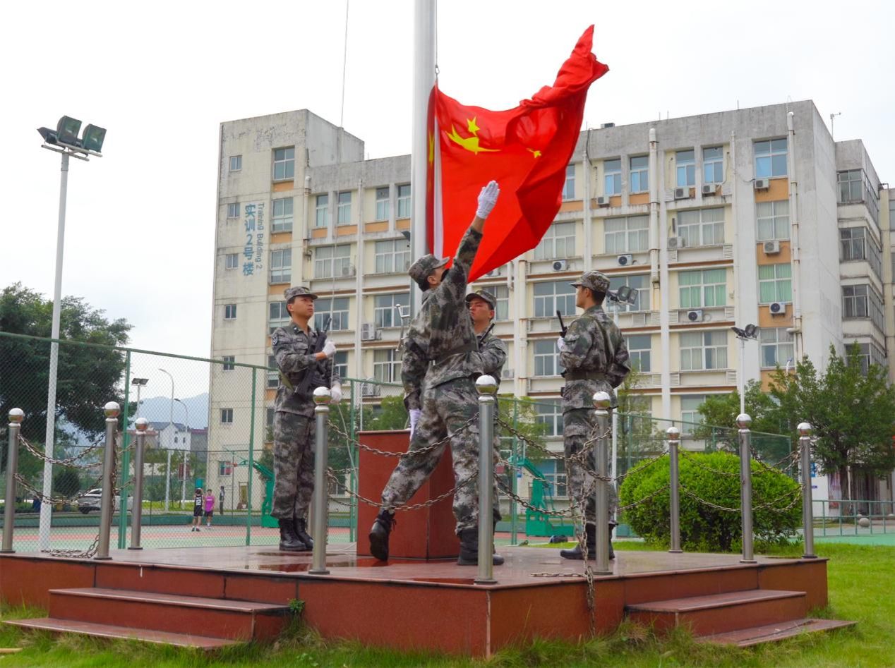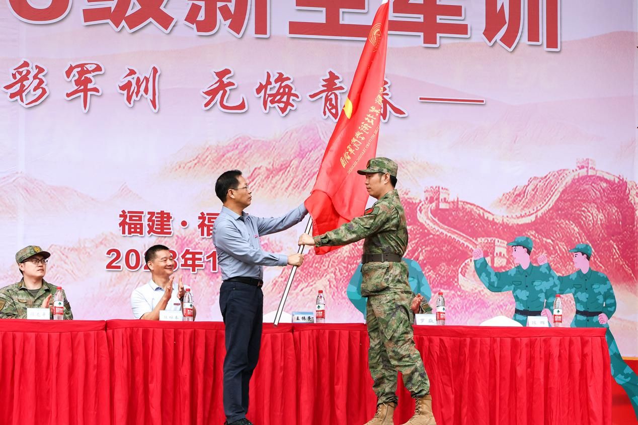党委副书记王振亮向军训团团长陈辉授军训旗帜,大旗挥舞潇洒飘扬,带动了参训学生们的热情。