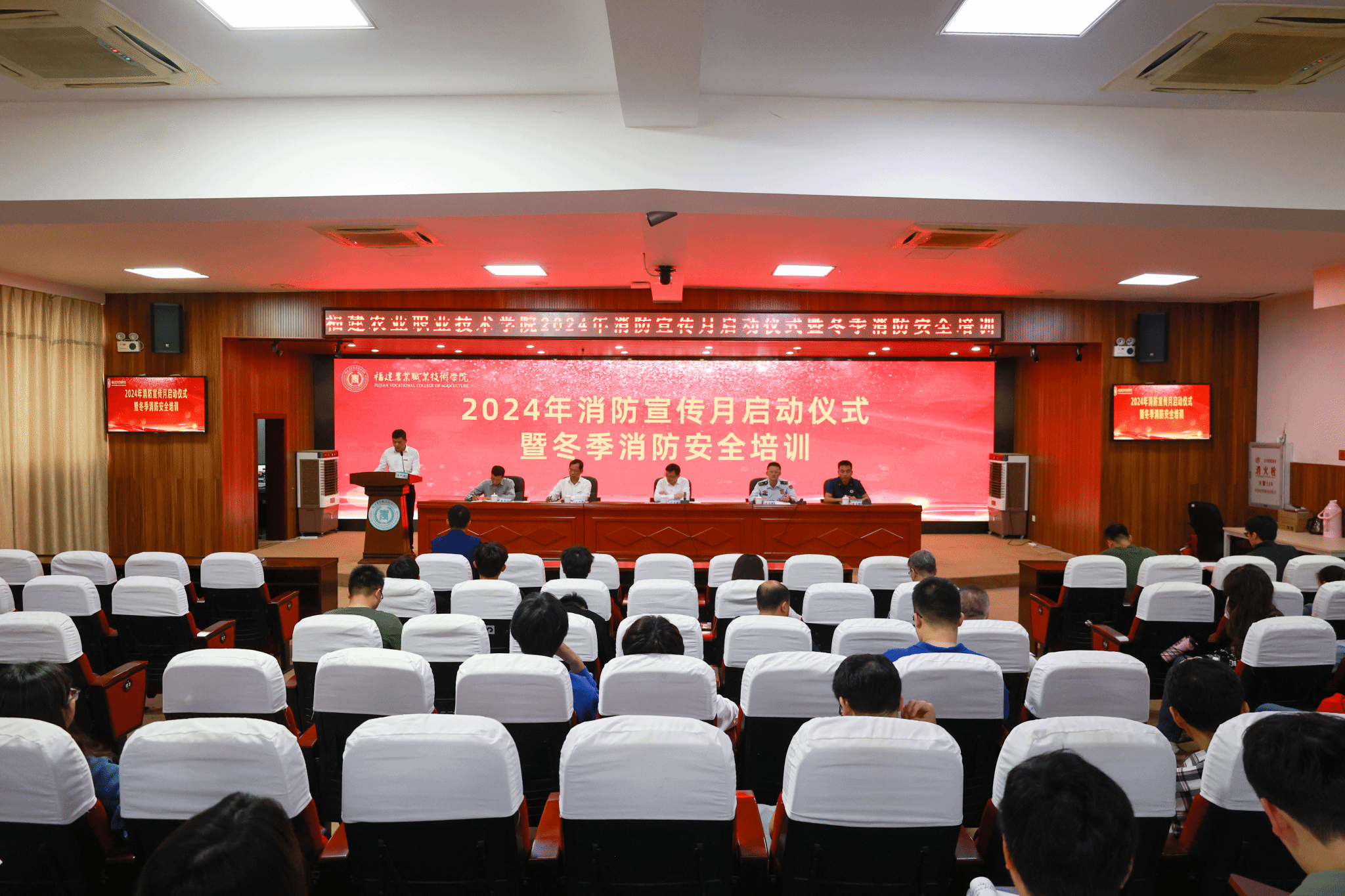 11月14日,学院在相思岭校区学术报告厅成功举行2024年消防宣传月启动仪式暨冬季消防安全培训。学院院长何东进、党委副书记王振亮,党委委员、宣传部部长兼学生工作部部长詹其仙,福清市消防救援大队参谋林良建、镜洋消防救援站相关人员以及各二级单位相关负责人、各单位安全员、实验室安全员、辅导员及学生代表等近200人参加。会议由安全保卫处处长陈剑波主持。