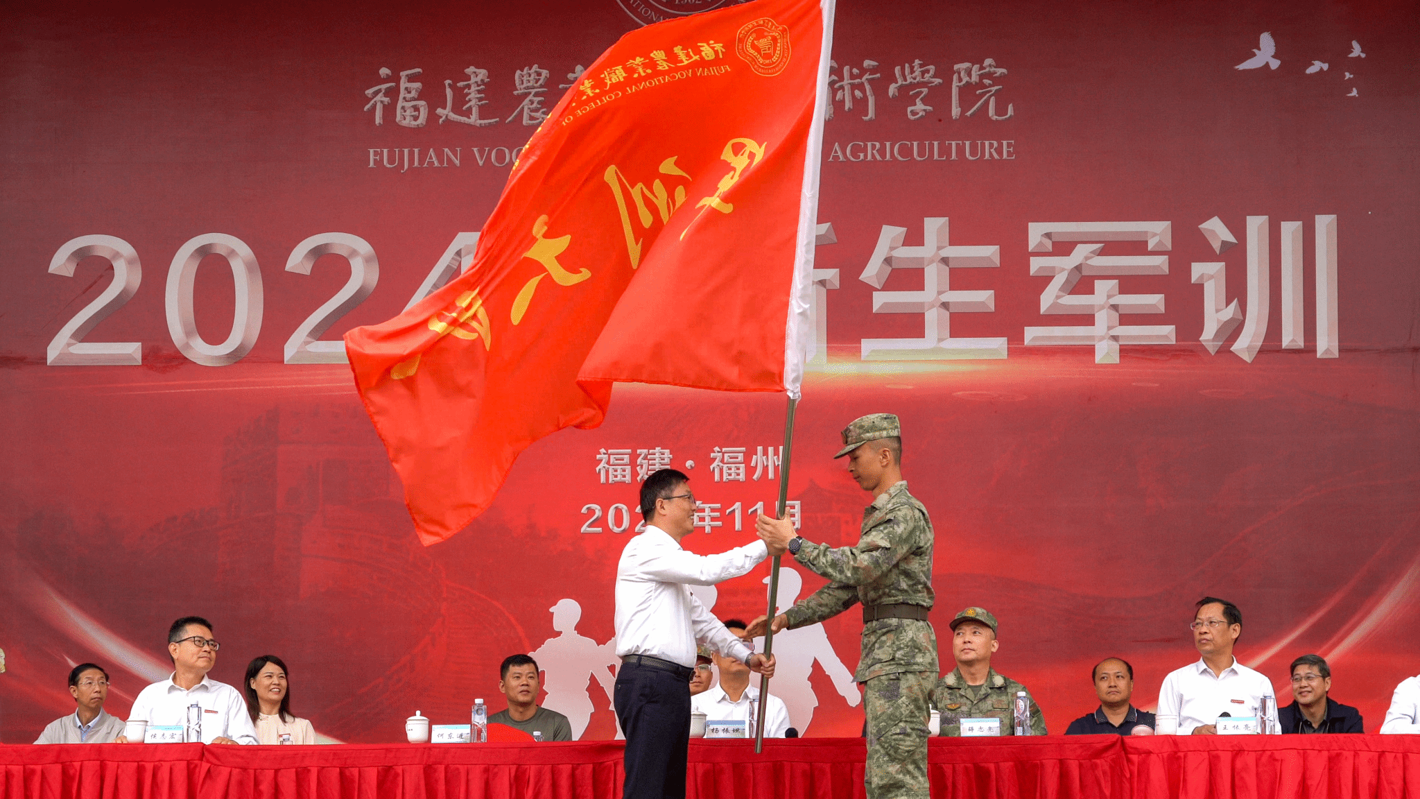 院长何东进向军训教官授军训旗