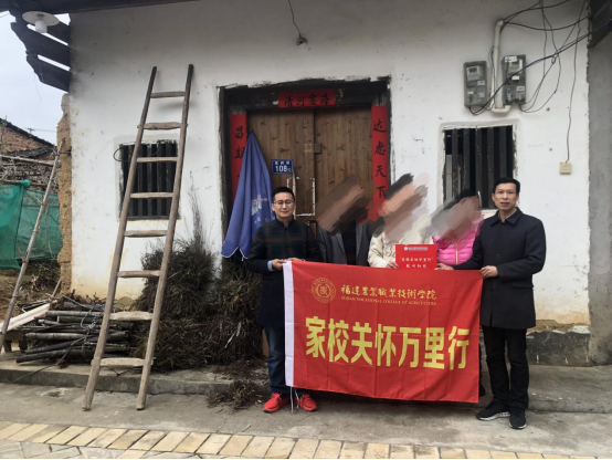 为强化资助育人效果,根据学校“家校关怀万里行”精准家访活动安排,1月11日,我院党总支詹其仙书记、辅导员杜海江老师组成第一小分队赴龙岩市上杭县珊瑚乡胡同学家,学工办负责人陈闻莉老师、刘小伟老师组成第二小分队赴漳州龙海区榜山镇洋西村郑同学家走访慰问。