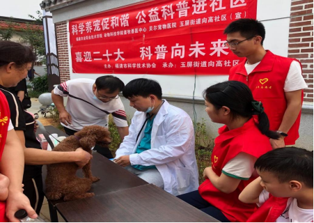 中,动物科技学院专业教师与贝尔宠物医院的宠物医生,为小区居民的爱犬进行公益体检,并为养犬居民讲解夏季饲养宠物的一些小常识。我院教师及学生党员、社区志愿者以发放倡议书、宣传手册等方式向过往居民宣传如何科学养犬,文明养犬,倡导群众提升文明规范养犬自觉性,牵紧“文明绳”、做个“文明人”,共同维护我们的美好家园。