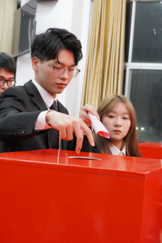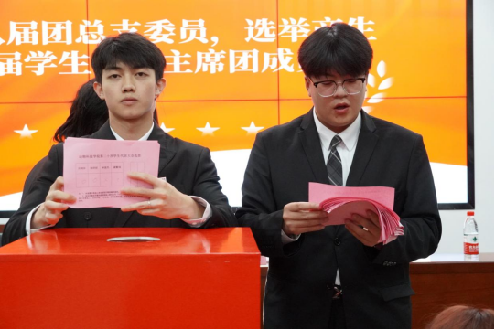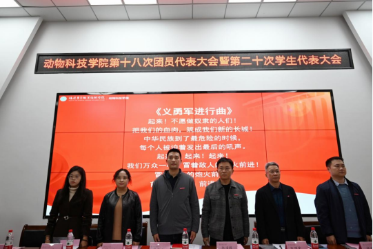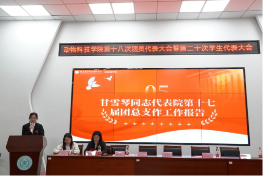 伴随着庄严的国歌声响起,动物科技学院第十八次团员代表大会暨第二十次学生代表大会拉开序幕。本次大会上,校团委张溪辉老师、校学工部蔡思雄老师、动物科技学院党总支阮国荣书记、韩云珍院长共同对大会的胜利召开表示祝贺并发表讲话,学院团总支副书记甘雪琴同学代表学院第十七届团总支做工作报告、学生会执行主席颜钰涵同学代表学院第十九届学生会做工作报告。随后,经过投票、唱票、审议等环节,大会选举产生了学院第十八届团总支委员与第二十届学生分会主席团成员。