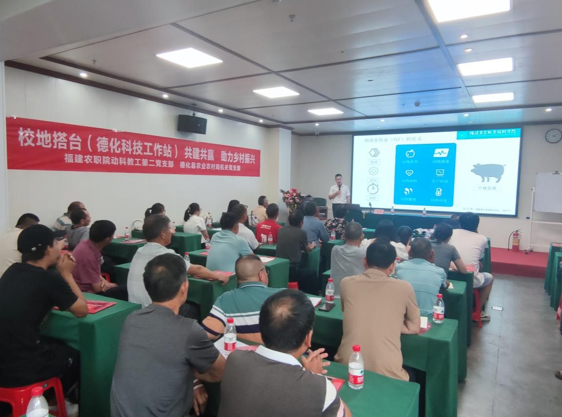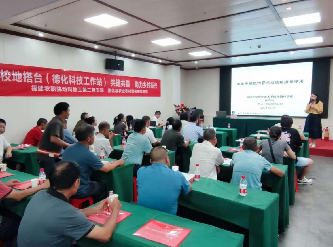 2024年8月22日-2024年8月23日,以和德化农业农村局机关党支部共同搭建的德化科技工作站为平台,动科教工支部动科兽医教研室支部书记林雪玲、支委赖宝色、党员教师谢开春、党员教师潘书磊及群众教师张佳博士,为泉州市德化县农业农村局举办的德化县“健康德化、防检先行”动物疫病防控技术培训班授课,党建与业务深度融合,发挥教工第二党支部的战斗堡垒及凝聚发挥群众作用,践行党员教师为农村基层服务宗旨,助力乡村振兴。