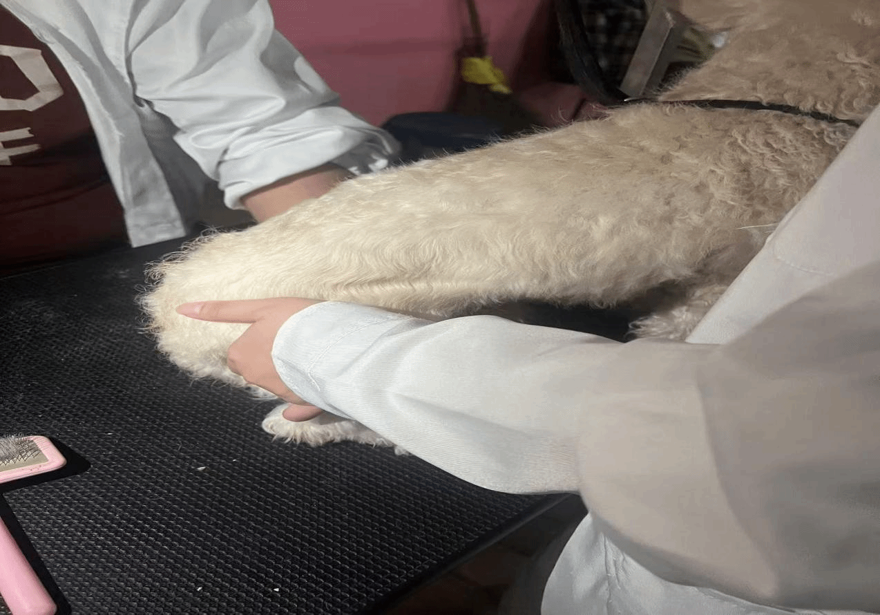 场景二:同学们在动物饲养院给狗狗们清洗毛发,修剪指甲