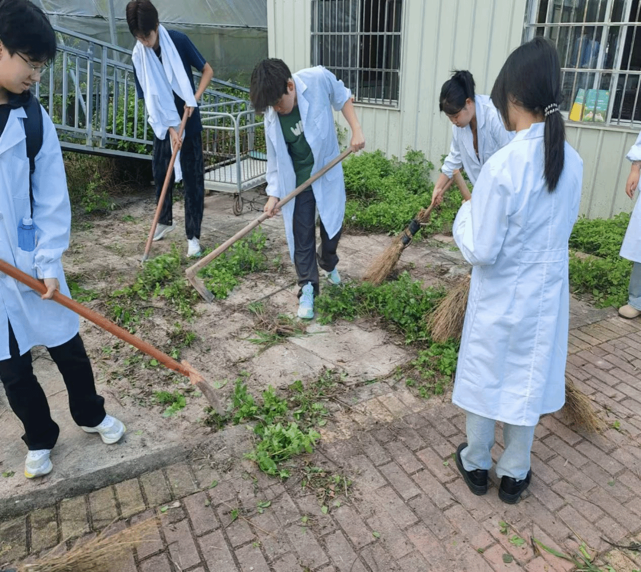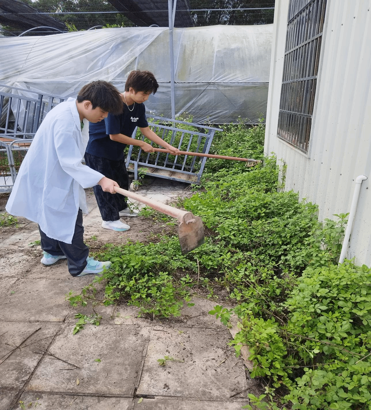 场景一:同学们在动物病房周围锄草