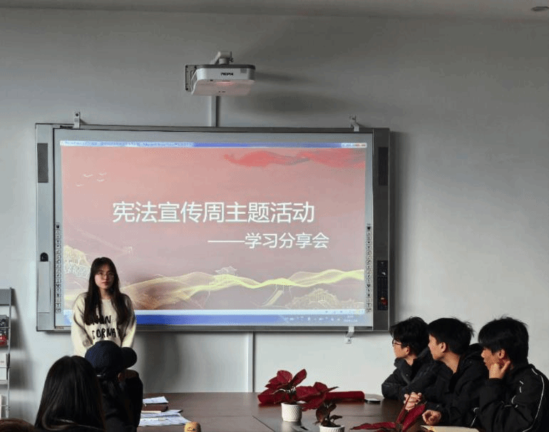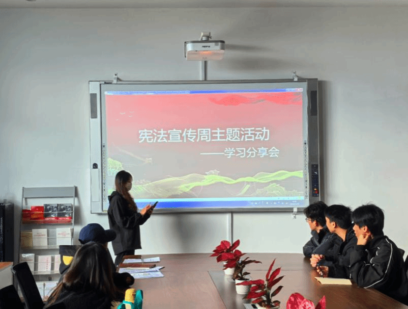 活动共分为三个环节。一是组织同学们通过青少年普法网观看第十一个国家宪法日教育系统“宪法晨读”直播活动;二是以讲授的形式带领同学们学习了民法典、国旗法、国歌法等相关法律知识;三是邀请了两位学生代表对本次活动进行了学习分享。