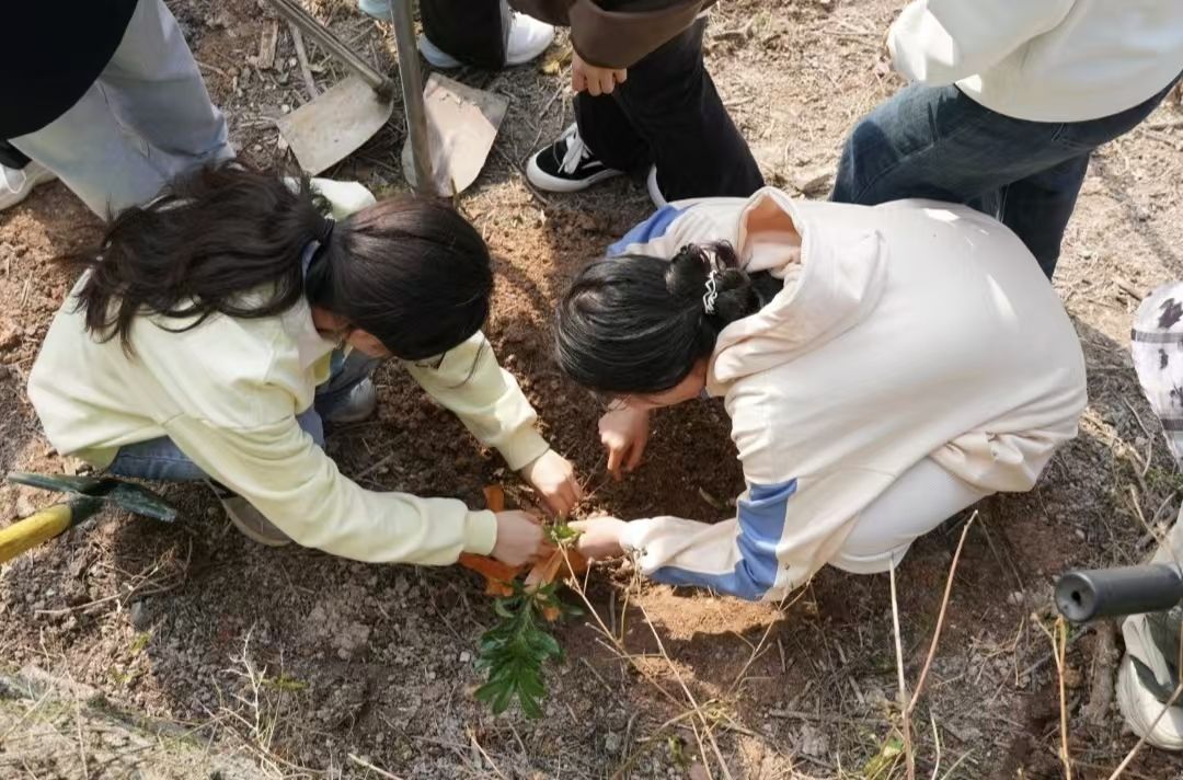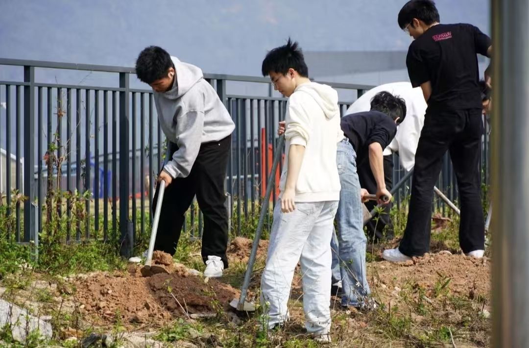 在3.12植树节活动中,同学们挥动锄头松土,种下绿色希望,体验“汗滴禾下土”的艰辛,收获劳动带来的喜悦。