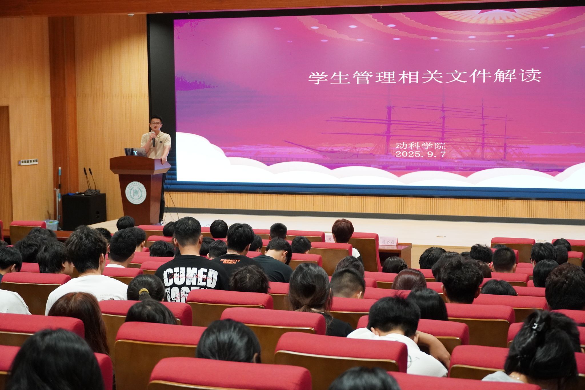 韩云珍院长详细介绍了动物科技学院自建院以来的发展历程和总体概况,她指出,近年来,学院在全面深化教育教学改革,强化产教融合,聚焦现代畜牧业人才培养需求等方面取得重要成绩,希望新生们珍惜宝贵的大学时光,夯实专业基础,勇于探索创新,努力为行业发展贡献属于自己的青春力量。