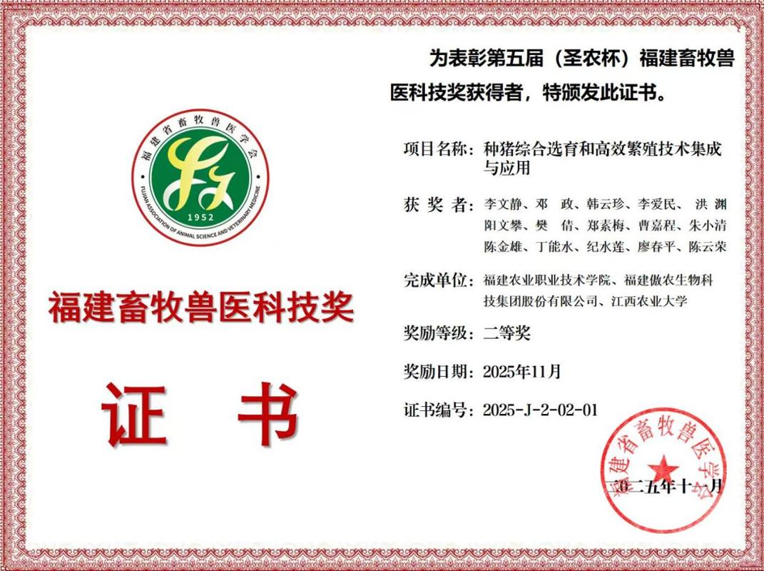 福建畜牧兽医科技奖由福建省畜牧兽医学会设立,旨在表彰在福建省畜牧兽医科技领域作出突出贡献的团队与个人,推动行业科技创新与成果转化。此次获奖的“种猪综合选育和高效繁殖技术集成与应用”项目,聚焦种猪育种与繁殖关键环节,通过技术集成创新,在提升种猪生产性能、优化繁殖效率等方面取得显著成效,为福建乃至全国生猪产业的高质量发展提供了技术支撑。