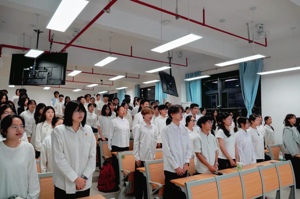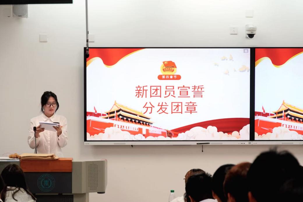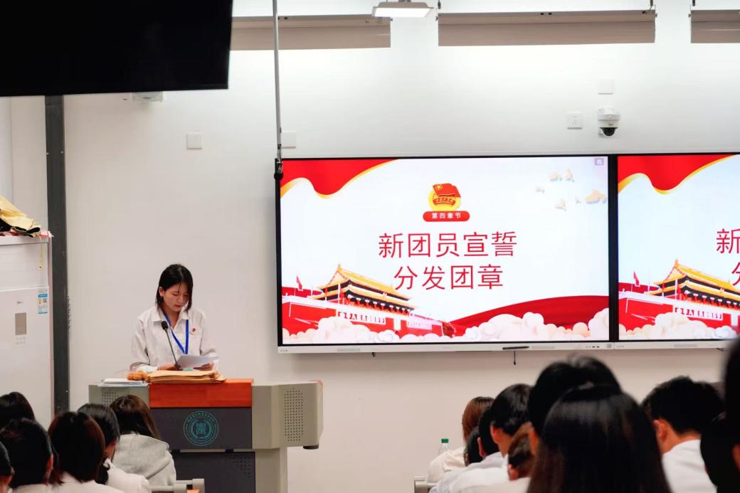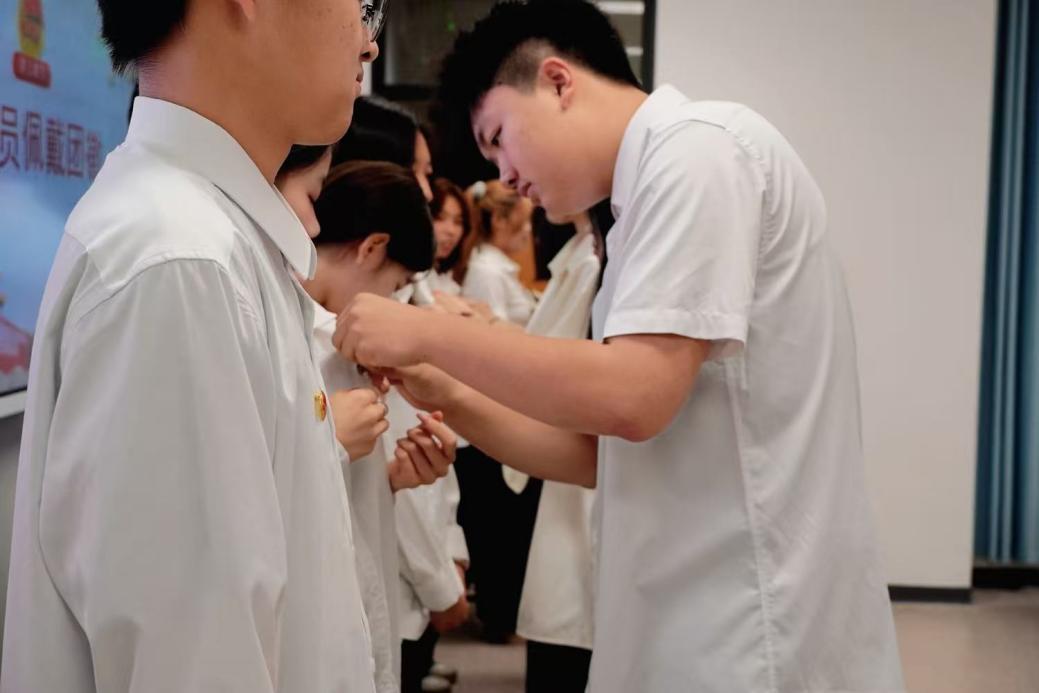 随着庄严的国歌奏响,全体人员肃立齐唱,仪式在肃穆的氛围中正式拉开序幕。团委学生干部蔡雨欣宣读了本期新发展团员的名单。随后,各班团支书为新团员佩戴团徽——那枚熠熠生辉的徽章,不仅佩戴在胸前,更承载着一份沉甸甸的责任与光荣使命。