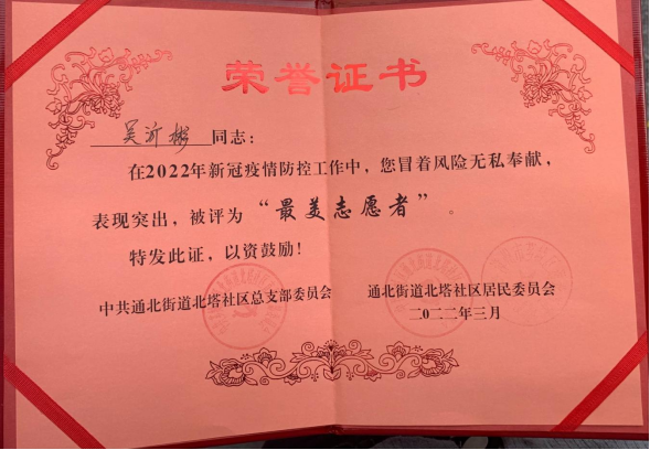 2022年3月学生党员吴沂彬被当地党支部评为“最美志愿者”