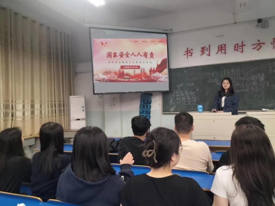 2024年4月10日,动物科技学院团委书记陈芬老师、专职辅导员张晓华老师为团委、学生分会成员开展围绕“国家安全是什么、为什么要维护国家安全、如何维护国际安全”为内容的主题教育,并结合当前国家安全形势,选取具有代表性的案例进行剖析,呼吁团委、学生分会成员要将“国家安全 人人有责”的观念入脑入心,切实筑牢安全防线。