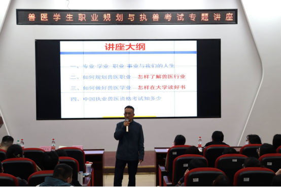 活动中,石达友教授围绕“专业·学业·职业·事业与我们的人生”、“如何规划兽医职业”、“如何做好兽医学业”、“中国执业兽医资格考试知多少”这四个方面深入浅出地阐释了兽医职业的内涵,引导大学生多角度、全方位、深层次地认知职业,并给学生带来执业兽医资格考试的相关资讯。林辉院长通过结合自身经历,与大家分享他的人生感悟和职业经验,激励学生找准自身定位,树立学习目标,尽早进行职业生涯规划。