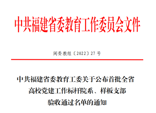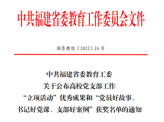近日,福建省委教育工委公布首批全省高校党建工作标杆院系、样板支部验收通过名单,我院学生党支部顺利通过验收。中共福建省委教育工委公布高校党支部工作“立项活动”优秀成果和“党员好故事、书记好党课、支部好案例”获奖名单。我院学生党支部获得党支部工作“立项活动”二等奖。