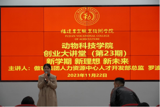 2023年11月20日晚上,动物科技学院在教学2号楼212(耕读书院)举办第二十三期创业大讲堂——“新学期 新起点 新未来”主题讲座。讲座由钟佳莲老师主持,傲农集团人力资源中心人才开发部罗波文总监主讲,130余名畜牧兽医和动物医学专业学生参加。