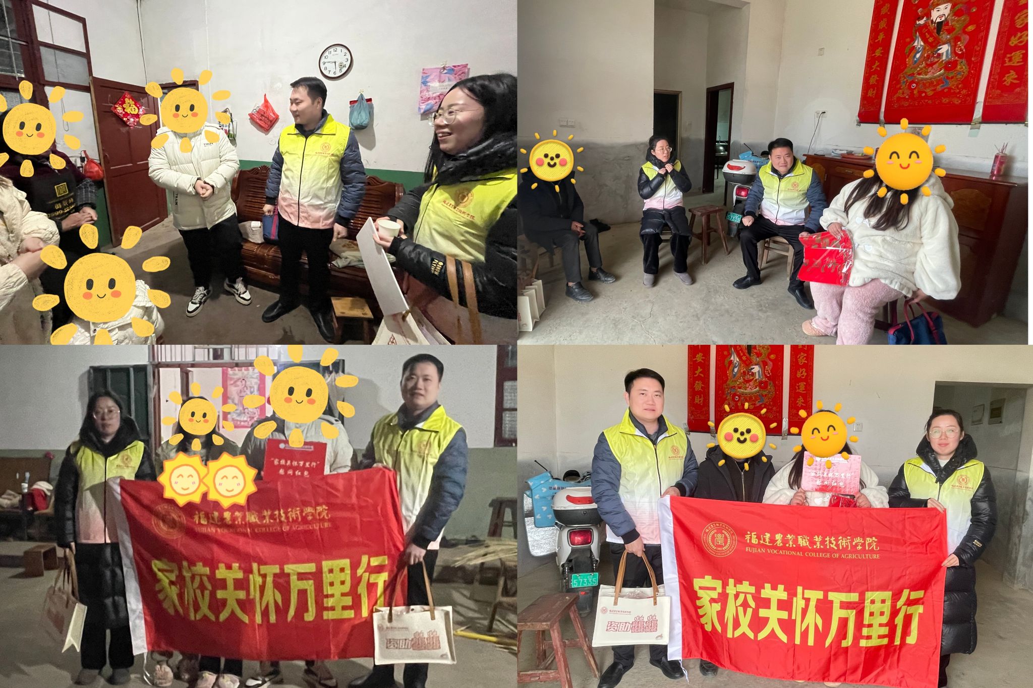 2024年1月24日-1月29日,动物科技学院分两队开展“家校关怀万里行”精准家访活动,一队由副校长严挺文老师带领院党总支书记阮国荣老师、辅导员叶延嵛老师、资助专员陈雯帆老师前往龙岩市长汀县大同镇与南山镇,另一队由院副院长林秋敏老师与院团委负责人陈芬老师前往南平市建阳区与武夷山市。