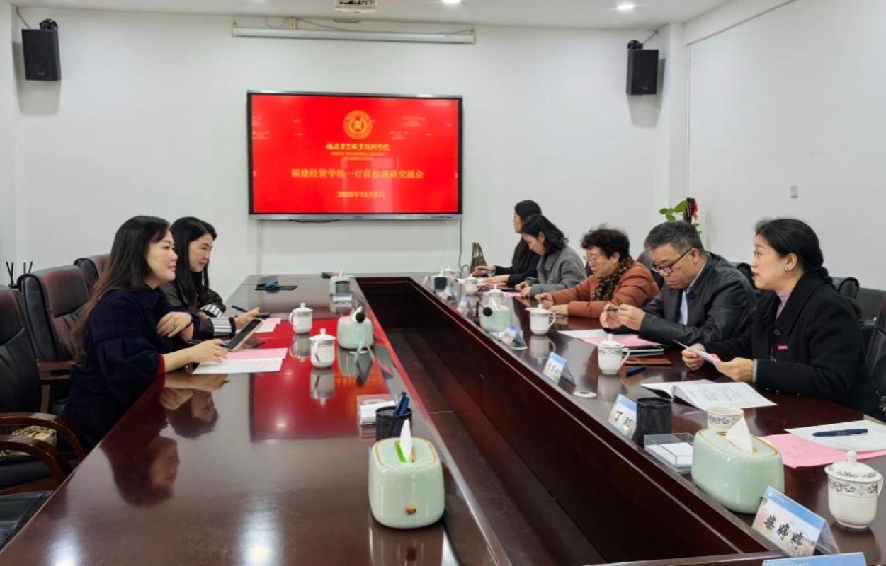 2025年12月3日上午,福建经贸学校招就办主任林彦馨、信息科学与艺术系服装教研室主任余琼莲等一行来校调研交流。学校顾问游金水,二轻学院院长李正心、副院长吴蕴珊、教务办主任丁玎、实训办主任桑建华、服装教研室主任吕玉玲及骨干教师代表参加了交流座谈会。会议由二轻学院院长李正心主持。