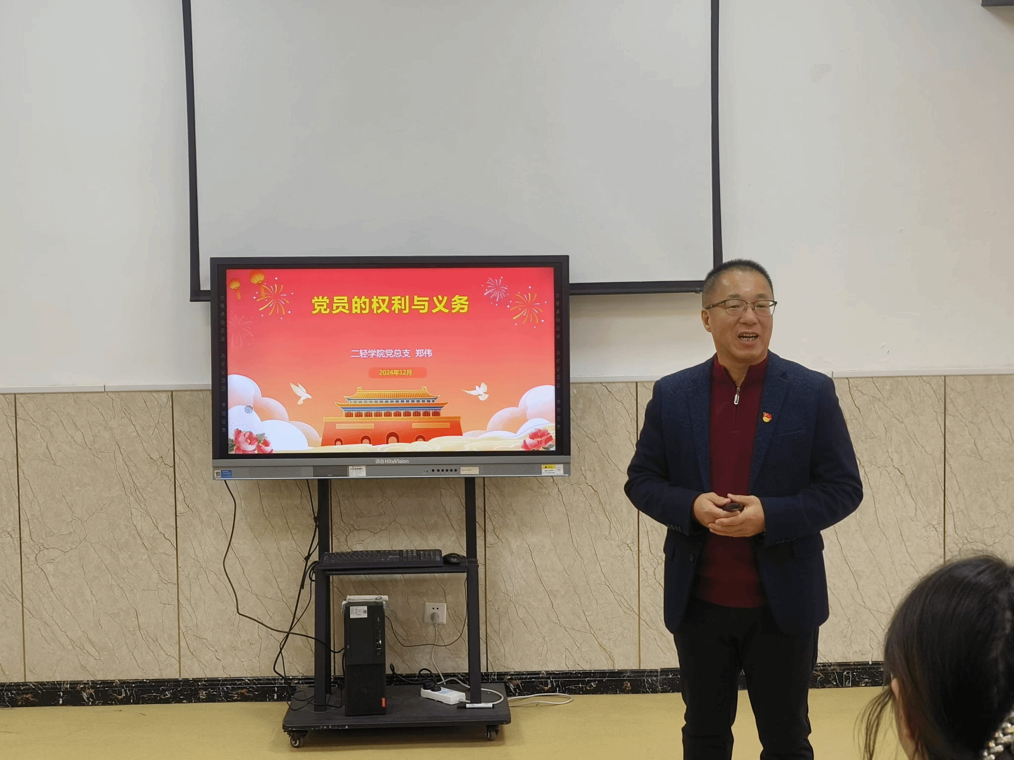 郑伟书记以《党员的权利与义务》为题,首先认真细致的向大家讲解共产党员的权利与义务,大学生如何锤炼自己,成为一名合格的共产党员。他希望团员们学思践悟笃行习近平新时代中国特色社会主义思想,学习贯彻党的二十届三中全会精神和习近平总书记系列重要讲话精神,努力成为具备专业技能和职业素养的高素质人才,为实现中华民族伟大复兴贡献力量。