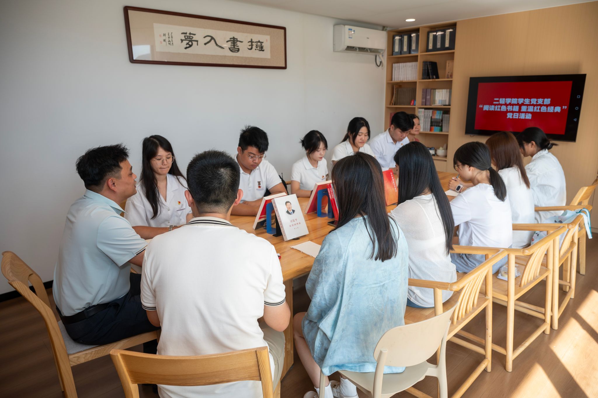 10月11日下午,二轻学院学生党支部于大梦书屋开展“阅读红色书籍 重温红色经典”主题党日活动。学院党总支副书记(主持工作)张一宁、组织员陈敏、学生党支部全体党员及入党积极分子共同参与,活动由党支部书记黄琳翔主持。