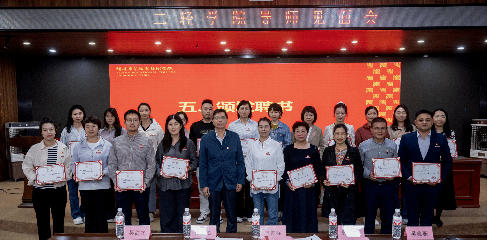 聘书授予环节氛围庄重而热烈。林俊标为全体党员导师与专业导师郑重颁发聘书,一纸聘书承载着育人重任,彰显着学院对人才培养的高度重视。学生们分组有序登台,向导师行拜师礼,导师们则为学生送上精心筹备的成长礼,躬身行礼间传递着治学之道,互赠心意中凝聚着师生深情,生动诠释了薪火相传的教育情怀与立德树人的育人初心。