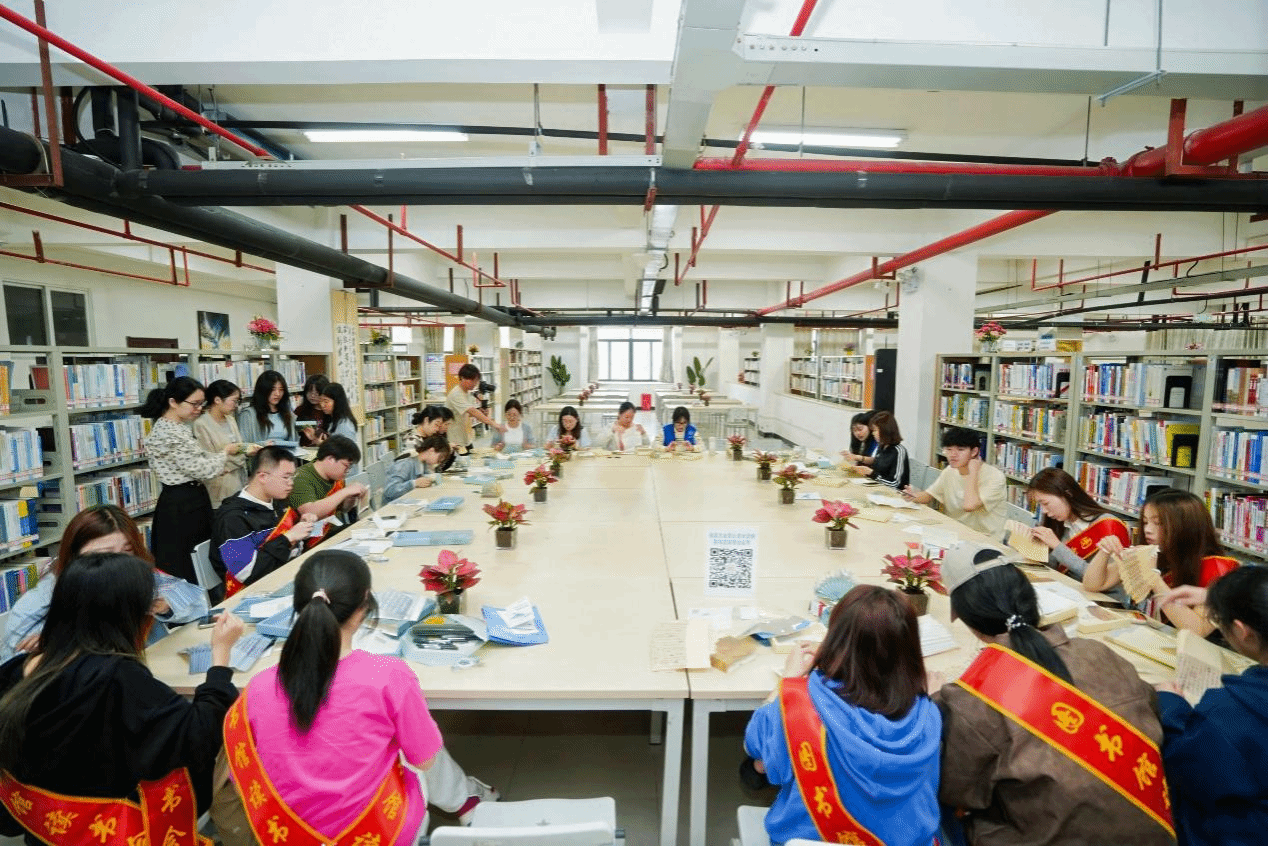图书馆一楼,系列活动同步展开。“红色经典阅读分享会”以党史为脉,凝聚信仰力量;“红色经典主题书展”精选百部典籍,赓续精神血脉;“书灯制作活动”将创意与实践结合,点亮阅读之美;“AI研学素养知识竞赛”依托智能平台,激发学子探索热情……其中,“非遗传承——剪纸艺术体验活动”体验区尤为瞩目,陈艺敏现场示范剪纸技法,师生执剪运纸,顷刻间花鸟虫鱼跃然呈现,传统艺术在指尖流转中绽放新生。