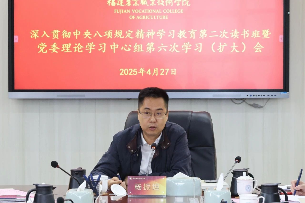 4月27日,院党委书记杨振坦主持召开深入贯彻中央八项规定精神学习教育第二次读书班暨第六次党委理论学习中心组学习(扩大)会,开展习近平总书记重要讲话精神专题学习、深入贯彻中央八项规定精神学习教育专题学习和重要文件精神专题学习。院党委领导班子成员、中专部主要负责人、各二级单位负责人参加了会议。纪要如下。