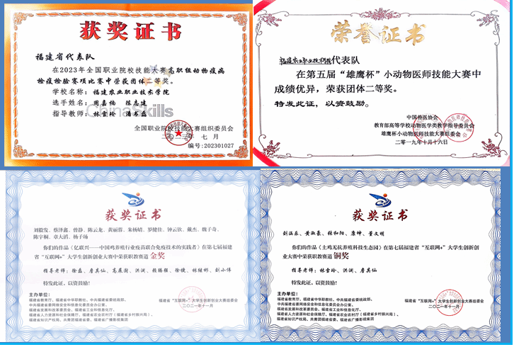 学生参加各类赛事取得优异成绩(图4),在全国职业院校技能大赛“动物疫病检疫检验赛项”获得二等奖4次,“雄鹰杯”小动物医师技能大赛二等奖3次;参加福建省大学生“互联网+”创新创业大赛,“亿联兴--中国鸡养殖行业疫苗联合免疫技术的实践者”项目获金奖,“土鸡无抗养殖科技生态园”项目获铜奖。