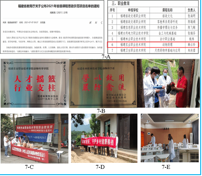 课程团队构建四个“一”课程思政融合方法,开展课后拓展系列活动,课程获评省级课程思政示范课程(图7-A)。学生运用所学为智慧动物诊疗APP问诊养殖户提供科学用药方案及后续用药咨询服务,累计服务2153人次。同时,为养殖户提供禽流感强制免疫接种服务,累计10000余羽,获得中共福清市委员会、福清市人民政府高度认可并授予“学以致用 严防禽流”牌匾(图7-B)。课程团队联合福州市农业农村局组织学生开展“消灭狂犬病——宠物防疫社区公益行(图7-C)”、制作科学用药宣传短文和滥用抗生素危害科普等系列活动(图7-D)。在新冠疫情期间,学生自发参与教室、实验室和宿舍消毒工作,提升公共卫生安全意识(图7-E)。