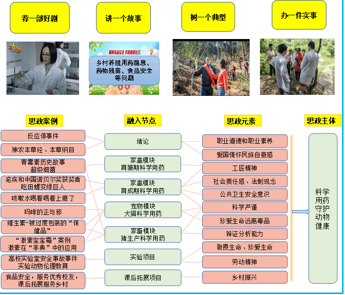 课程团队以建设《动物药理》省级课程思政示范课程为契机,构建四个“一”课程思政融合方法(图1)。将扎根基层服务三农意识、吃苦耐劳精神、科学用药思维等思政元素有机融入课程教学,实现专业教学和课程思政同向同行。课程开课前推荐“一部好剧”,如功勋之屠呦呦的礼物,激发学生民族自豪感。在每个任务开始前引出与乡村养殖药物滥用和动物食品安全等相关的“一个故事”,帮助学生树立科学用药观念。课中引入高光健等优秀校友扎根基层,服务乡村,助力脱贫攻坚的“一个典型”,增强学生服务三农的使命感。课后拓展,学生运用专业知识,为智慧动物诊疗APP问诊养殖户及学校周边乡村养殖户办“一件实事”,履行服务乡村振兴重要使命。