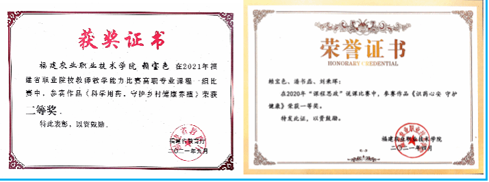 课程团队教学能力显著提升(图5),《科学用药,守护乡村健康养殖》参赛作品获省教学能力比赛二等奖、《动物药理》说课程比赛获校级一等奖、《识药心安 守护健康》参赛作品获校级课程思政说课比赛一等奖。