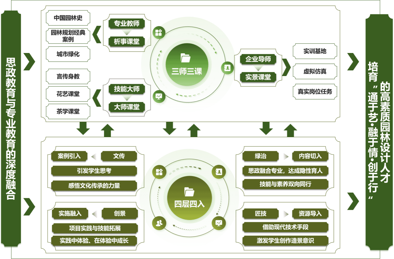 2.四层四入:挖掘“文传、绿治、匠技、创景”四个层面思政元素,从“案例引入、内容切入、资源导入、实施融入”四个方面将思政融入课程内容;通过“案例引入”,引发学生思考,感悟文化传承的力量;通过“内容切入”将绿色治理意识融入专业知识体系,使学生在学习专业知识的同时,潜移默化地接受思想政治教育。“资源导入”利用多媒体、网络平台等现代技术手段,展示优秀设计案例,拓宽知识探索边界,激发学生创作造景意识,使学习更加立体多元;“实施融入”阶段,通过项目实践、拓展技能教学等形式,厚植匠心,让学生在实践中体验、在体验中成长,实现思政教育与专业教育的深度融合。