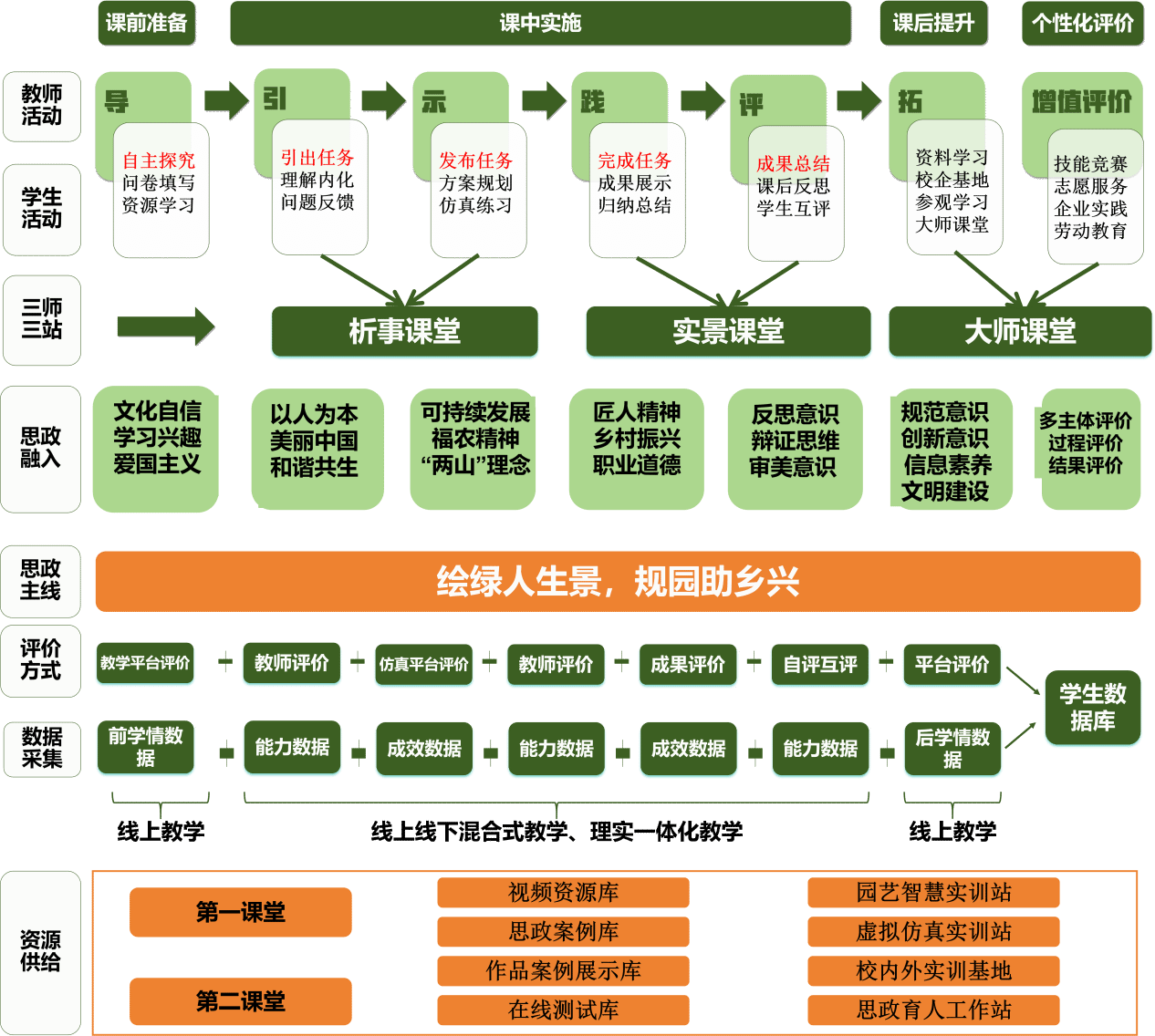 线下资源依托校企合作,搭建“园艺智慧实训站、虚拟仿真实训站、校内外实训基地以及思政育人工作站”,建设园艺智慧中心、搭建交互式虚拟仿真课程资源,丰富第一课堂教学方法;校企共建校内校外实训基地,将企业文化与校园文化相融合,模拟真实工作场景;与企业合作建设思政育人工作站,带领学生参与下乡助农活动、红色之旅活动、乡村振兴志愿活动以及茶艺、花艺大师工作室课程,充实第二课堂教学资源;同时,挖掘课程相关技能竞赛、证书资源,真正做到德技双修、全程育人,培养“通于艺·融于情·创于行”的高素质园林设计人才。