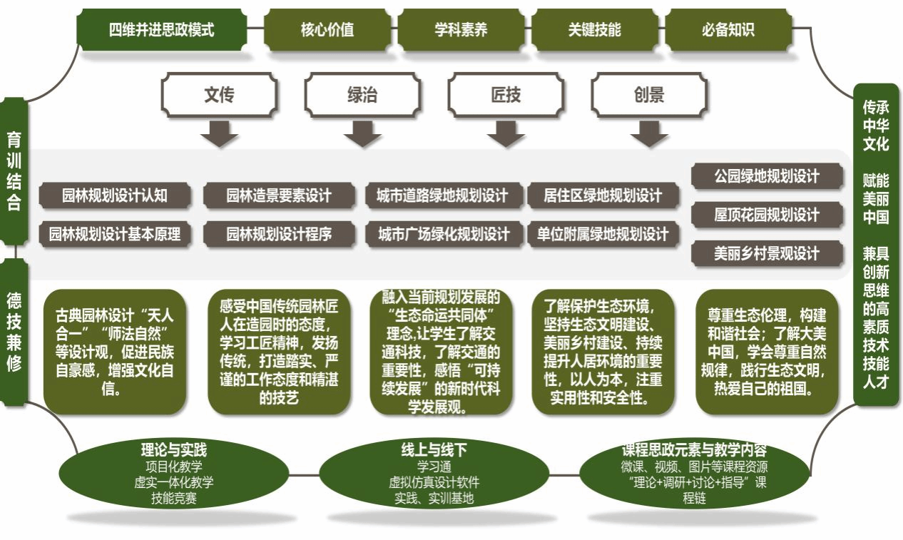 《园林规划设计》是园林技术专业核心课程,立足新时代职业教育要求,依据国家专业教学标准、结合园林设计岗位标准,将园林景观设计与施工技能大赛标准、园林绿化工证书标准的知识点、技能点有机融入课程内容,以园林设计典型工作过程所需能力,将课程内容序化为11个项目,确立“绘绿人生景,规园助乡兴”思政主线,融入大国工匠、中华传统文化、社会主义核心价值观、美丽乡村等思政元素,凝练“文传、绿治、匠技、创景”课程思政体系,培养能因地制宜地规划和设计各类园林绿地的高素质技术技能人才。