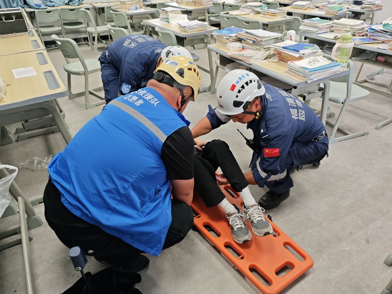 最后进行的是避难场所启动演练。演练现场,蓝天救援队迅速搭建起救助帐篷,模拟地震灾害发生后的临时避难场所。同时,救援队成员运用专业的急救手法,对模拟伤员进行紧急包扎处理,并在确保安全的前提下,将“伤员”平稳转运至操场临时医疗救护点,为伤员提供进一步的医疗救治。整个演练过程紧张逼真,救援队成员的专业操作让师生们对地震灾害发生后的应急救援流程有了更加直观的认识,也让大家深刻感受到了专业救援力量在灾害应对中的重要作用。