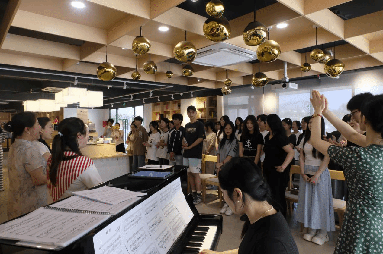 音乐会的压轴环节是全体师生合唱李叔同的《送别》。在黄烁老师的钢琴伴奏下,“长亭外,古道边”的悠扬歌声回荡书屋,不少师生眼含热泪。“合唱时,我感受到诗词与音乐跨越时空的力量。”一名参与学生表示。