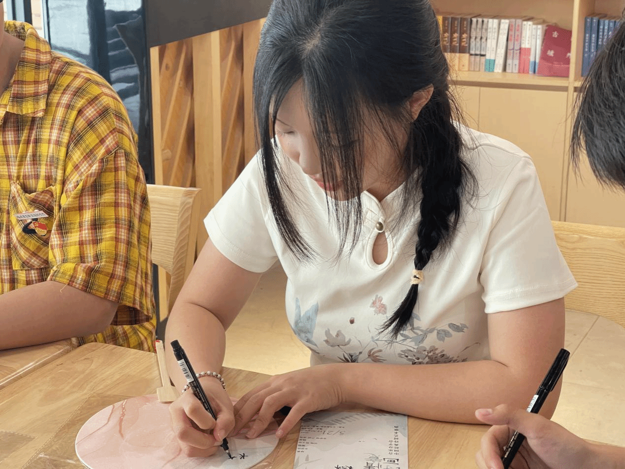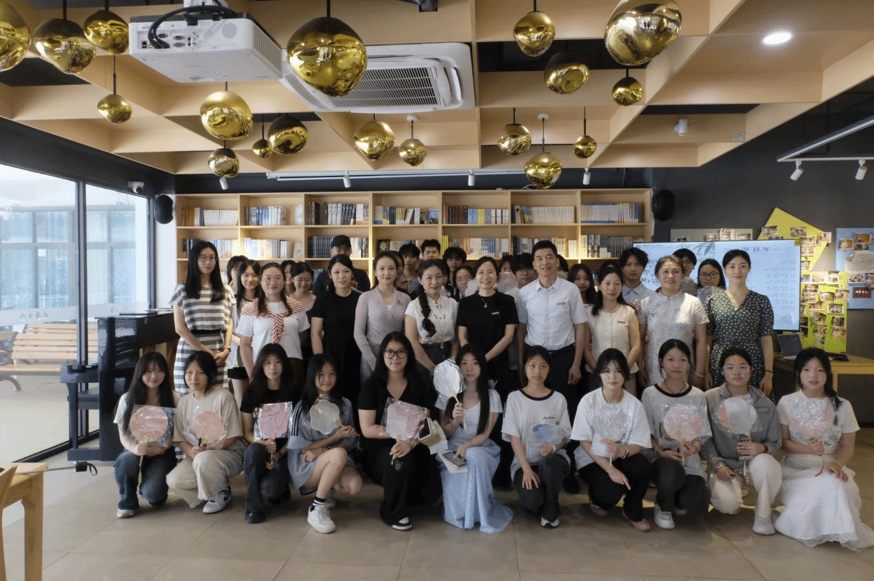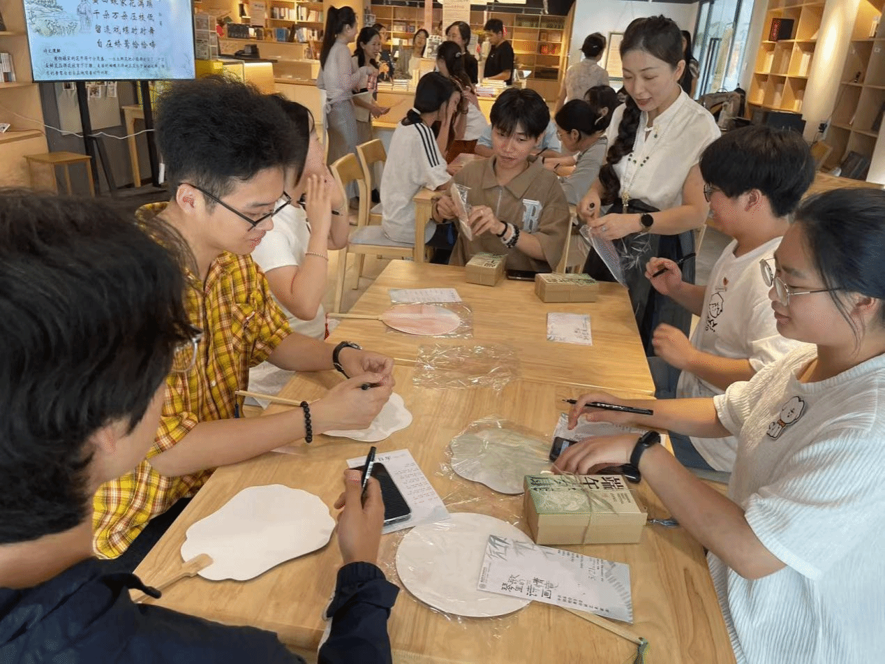活动不仅限于聆听,更注重互动体验。现场为师生提供了精美的空白纸扇,邀请观众注入巧思,在扇面题写心仪诗句。一位学生在扇面写下“春花秋月何时了”后感慨:“一边听《春花秋月何时了》的演唱,一边挥毫泼墨,仿佛置身古代文人雅集。”纸扇轻摇间,诗词的墨香与琴歌的韵律悄然交织,为传统文化赋予新的表达方式。活动尾声,师生手持题诗纸扇合影留念,为这场文化之旅画上诗意句点。