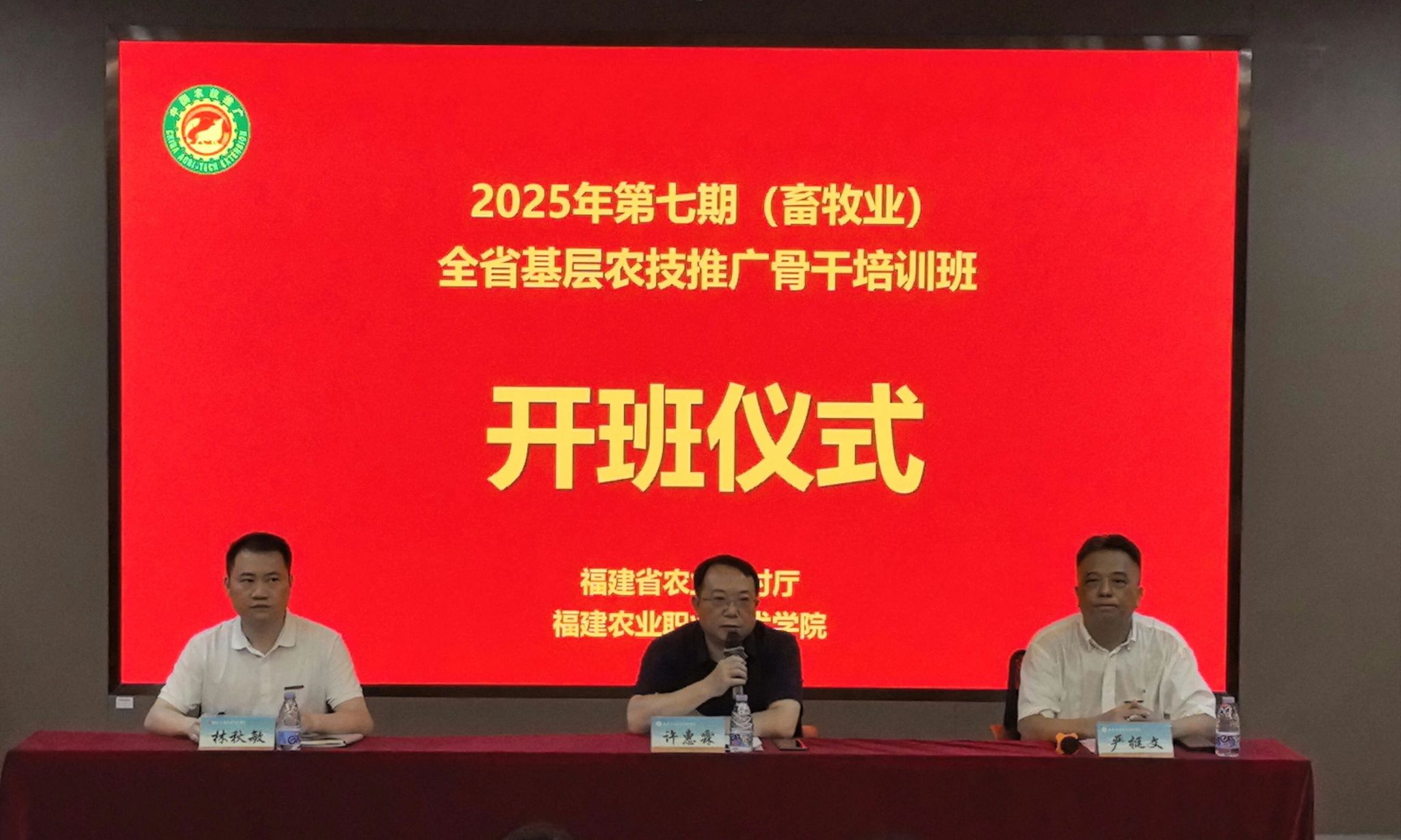 9月8日上午,2025年第七期(畜牧业)全省基层农技推广骨干培训班开班仪式在我院首山校区举行。福建省农业农村厅科教处处长许惠霖、四级主任科员叶明荃、一级科员林诚怡,学院党委委员、副院长严挺文、现代农业培训学院相关负责同志以及来自全省各地的80名基层农技员参加了开班仪式。