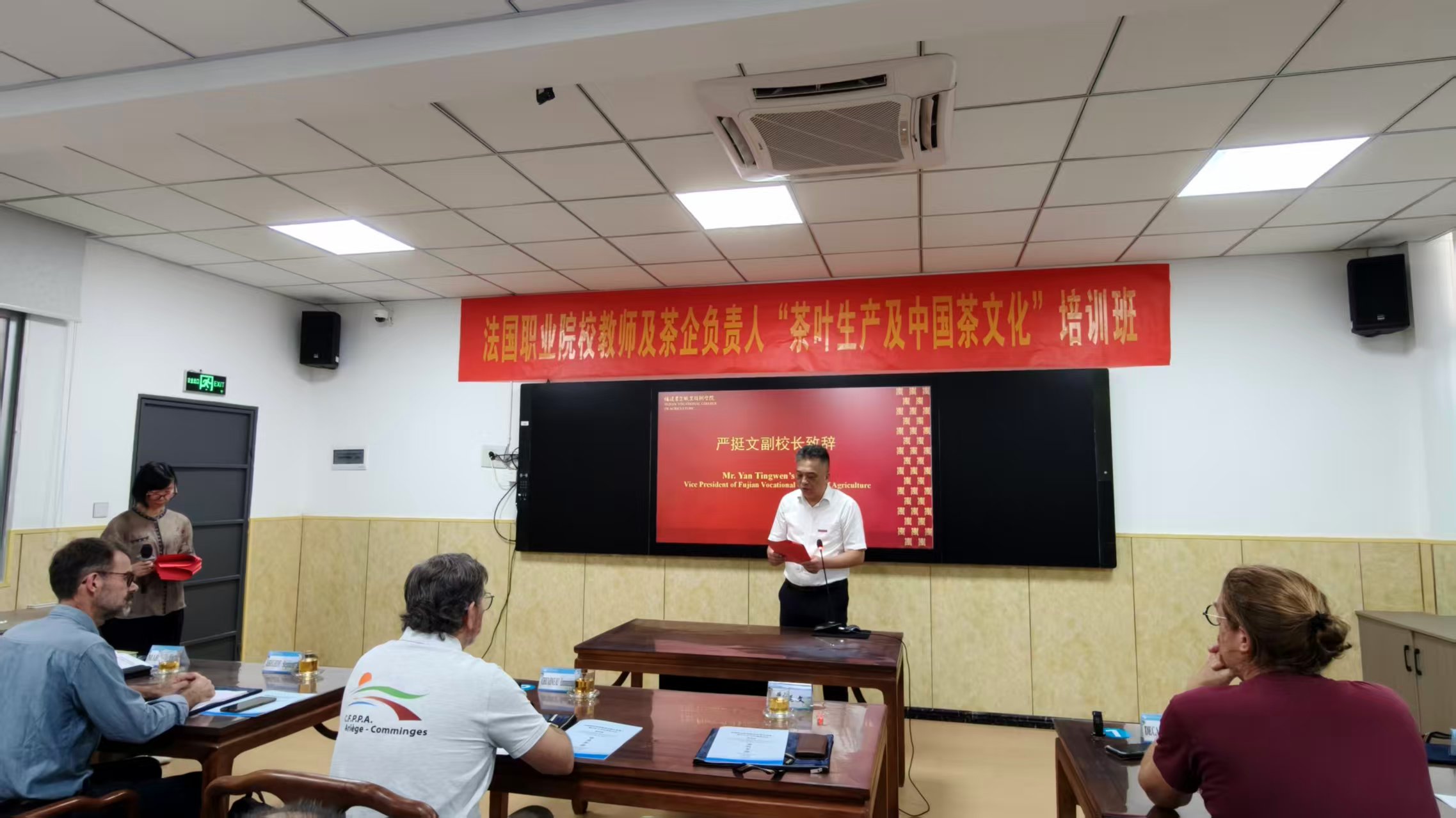 10月20日上午,培训班开班仪式在首山校区教学楼202教室举行。学院党委委员、副院长严挺文出席仪式并致辞。他在致辞中介绍,福建作为闽茶发源地,孕育了茉莉花茶、红茶、乌龙茶、白茶等知名茶类,积淀了深厚的茶文化底蕴。作为东南亚职业教育产教融合联盟理事单位,学院已在全球10个国家设立国际福茶文化推广中心,始终致力于推动中国茶文化的国际传播与职业教育协同发展,他代表学院热烈欢迎法国学员来校学习。