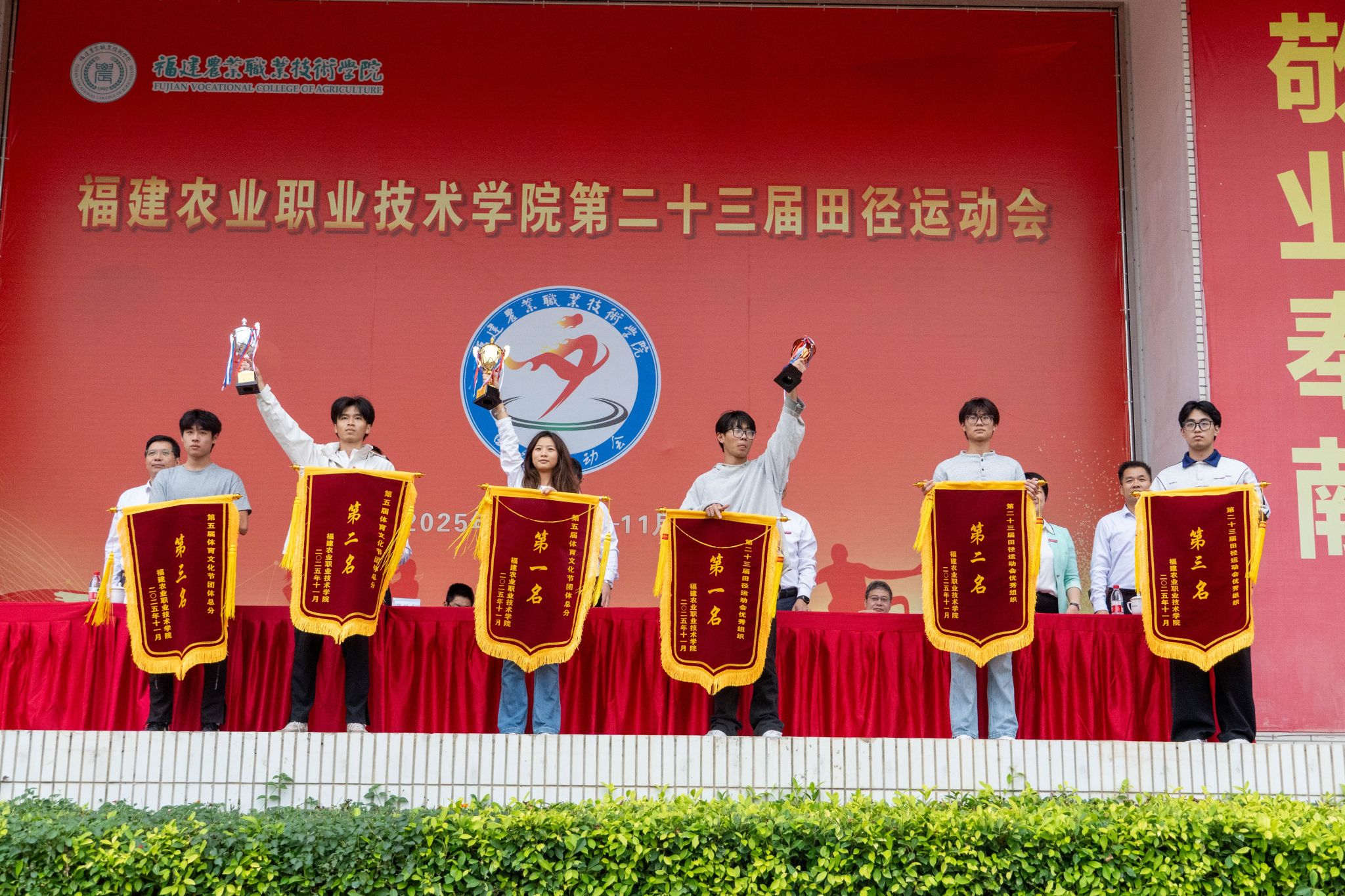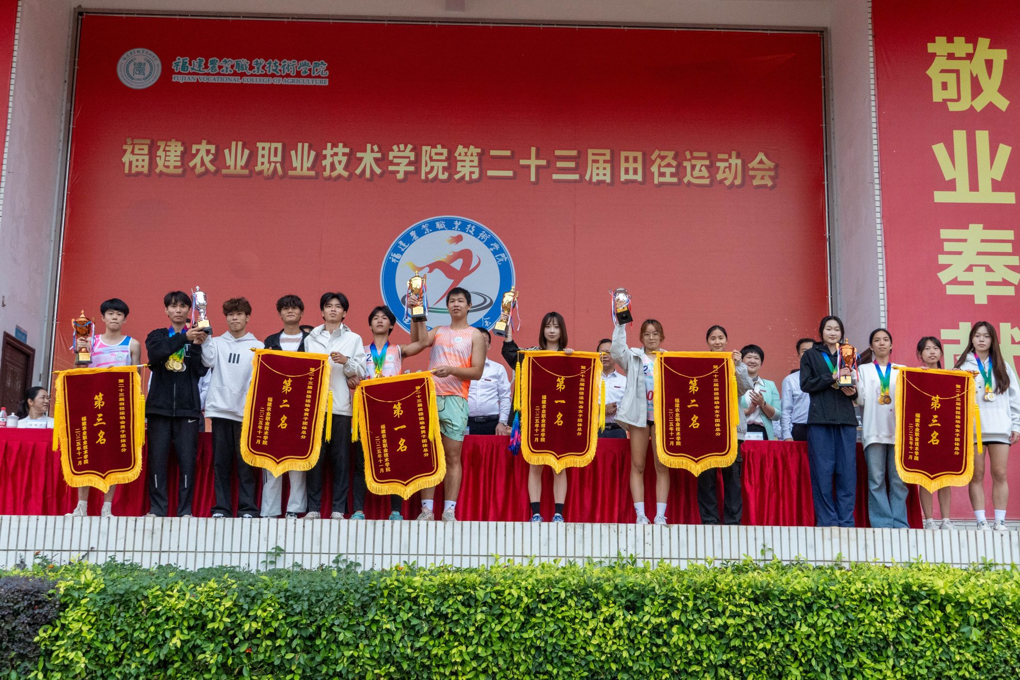在裁判长宣读竞赛成绩之后,出席仪式的校领导为本届田径运动会与体育文化节相关赛项获奖单位和个人颁奖。