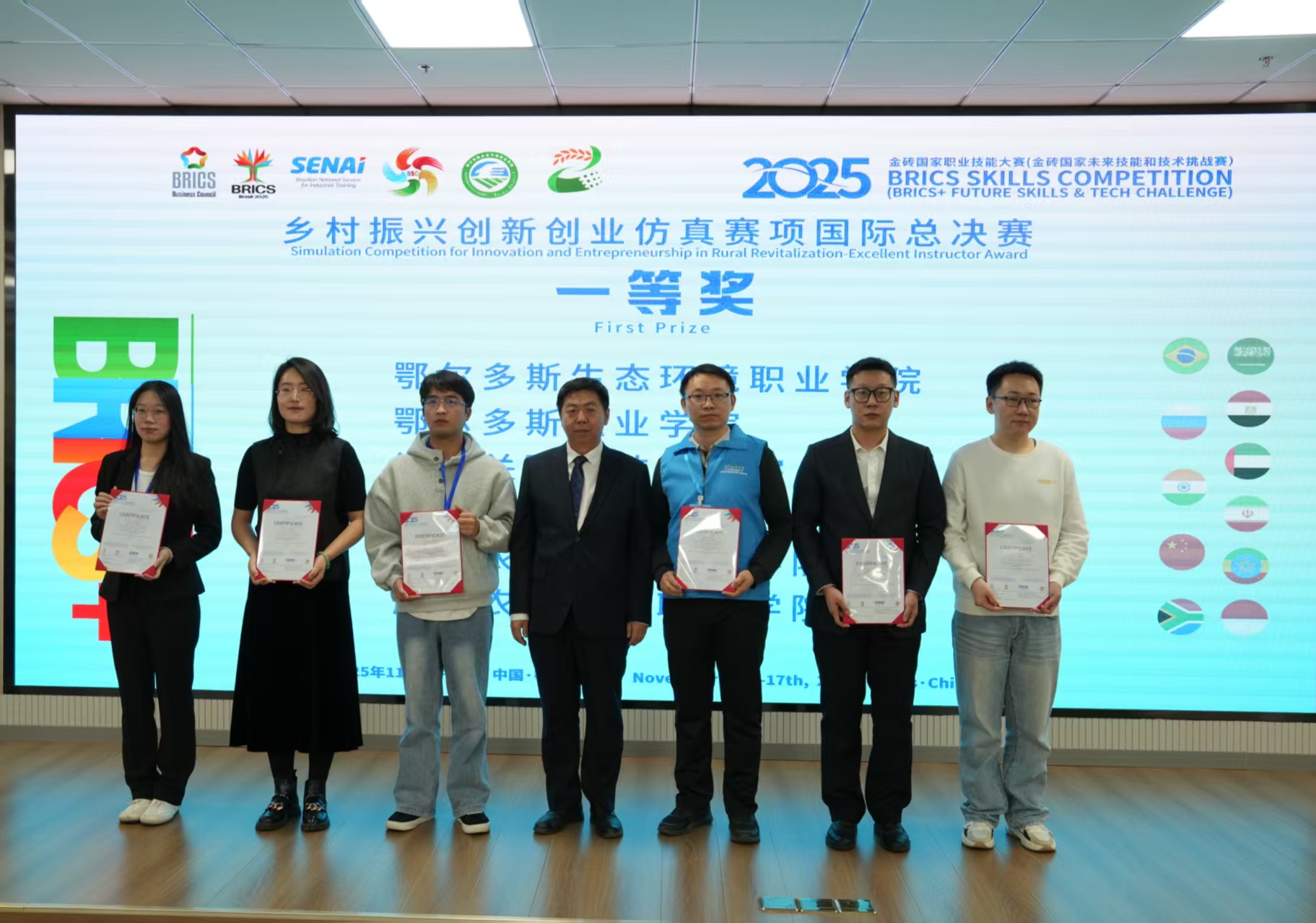 11月17日,2025年金砖国家职业技能大赛乡村振兴创新创业仿真赛项国际总决赛在鄂尔多斯生态环境职业学院圆满收官。为期三天的赛事汇聚中国、印度、南非、加纳、乌干达、摩洛哥6国共80支参赛队伍,设置两大核心模块展开多维度考核。模拟经营对抗模块依托“数字农业经济管理仿真教学平台”,融合产业策划、数字化运营等实操环节;创业计划设计及答辩模块聚焦乡村振兴痛点热点,按商业模式画布梳理思路、编写并答辩创业计划书,全方位检验选手综合能力。