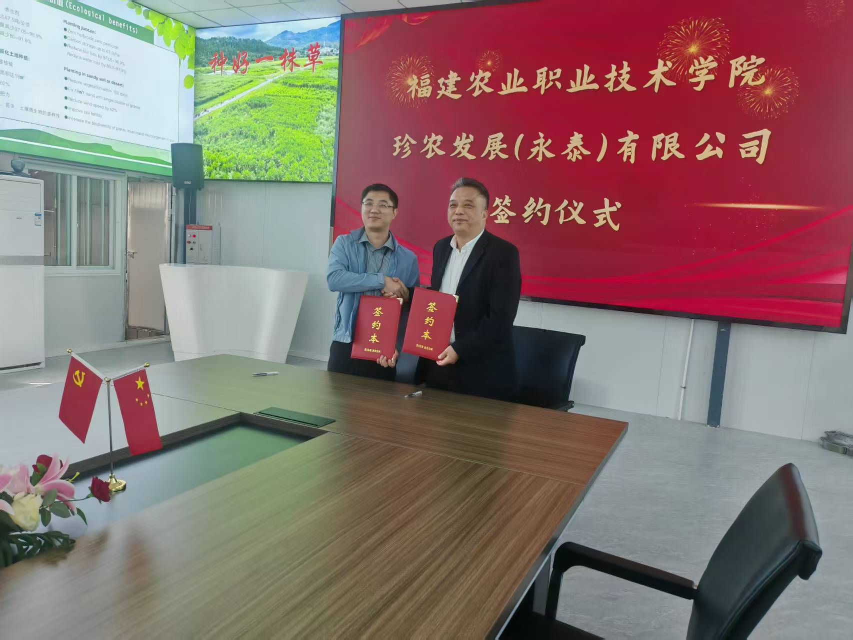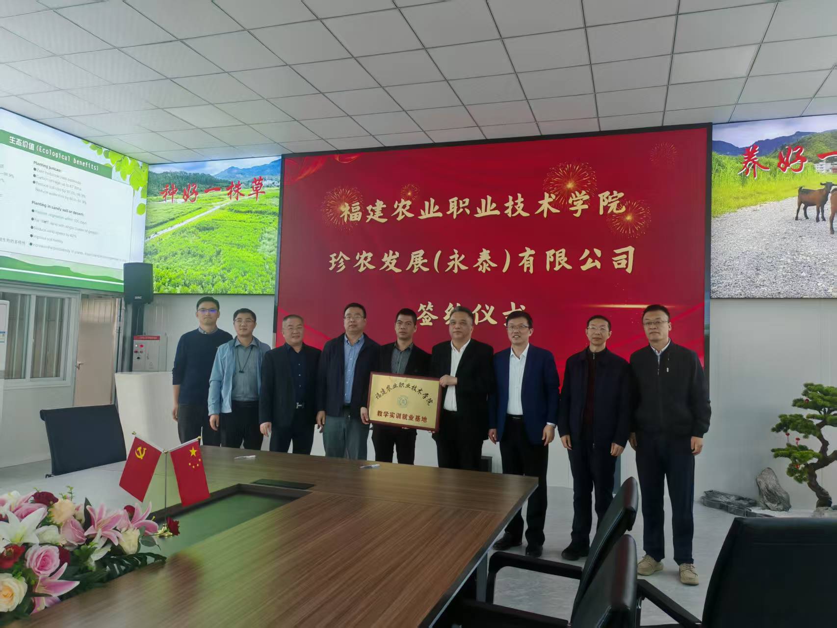 同日,何东进一行走访福建珍农发展有限公司开展“访企拓岗”行动。严挺文与公司总经理王荣男签署教学实习基地协议并授牌。未来,双方将围绕菌草种植、畜禽养殖等产业链环节,共同开展实习实训、技术研发与人才培养。珍农公司作为菌草循环农业示范企业,其“草-饲-养-肥”零废弃模式将为动物科技、生态农业等专业学生提供真实生产场景与实践岗位,推动“教学-科研-生产”深度融合。