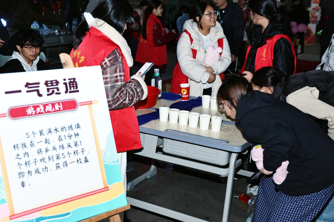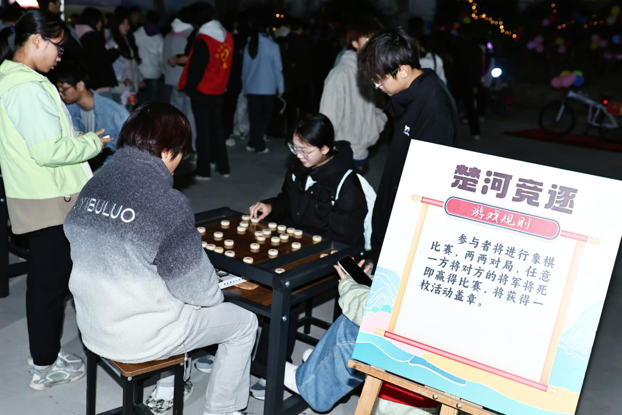趣味游戏区更是热闹非凡,各摊位前均排起长队:“好运圈圈乐” 摊位上,师生手持套圈全神贯注瞄准元旦主题小礼品,套中时的欢呼声此起彼伏,奏响欢乐乐章;趣味投壶处,大家屏气凝神将箭矢投向壶中,成功入壶时的自豪笑容格外耀眼;“一气贯通” 游戏里,同学们鼓足腮帮奋力吹气,当乒乓球顺利从第一个杯子吹至第五个时,成就感油然而生,现场掌声与喝彩声不断;表情包猜成语环节,大家围着卡片上的表情苦思冥想,猜对时的欣喜之情难以掩饰,仿佛收获了珍贵宝藏;象棋“楚河竞逐”赛场,选手们两两对弈、斗智斗勇,专注的神态、精妙的走棋引得围观师生阵阵赞叹。
