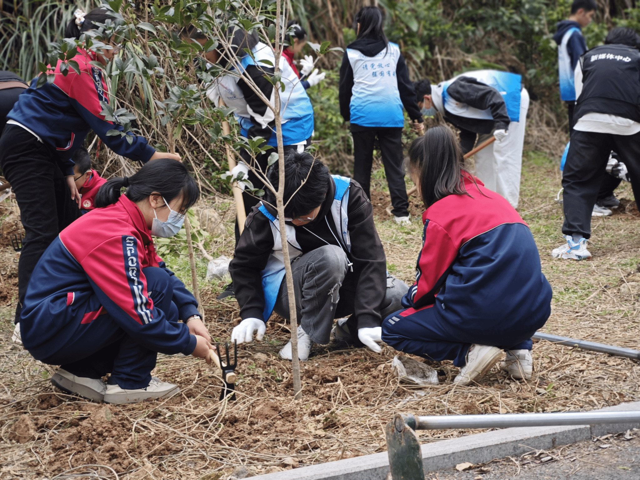活动现场,师生们热情高涨,在党员教师的指导下,大学生志愿者和小学生一对一结队,分工协作,共同栽植榕树、桂花树、橘子树等40余株。种植结束后,同学们纷纷在标有树种介绍的标签上进行记名认养,以便后期进行定期养护,别开生面的生态实践课让同学们颇为欣喜。