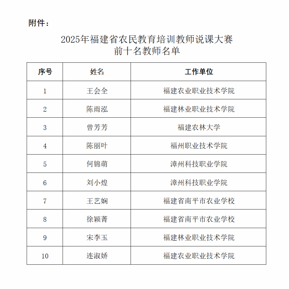 附件:2025年福建省农民教育培训教师说课大赛前十名教师名单