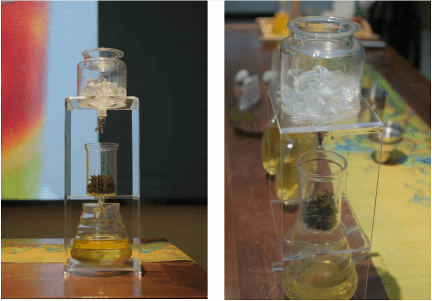 1. 冷萃茶底:提前将福州茉莉花茶用4℃冰水慢浸3小时,或用冰滴法(如下图),静置等待冰块融化,慢慢滤茶。