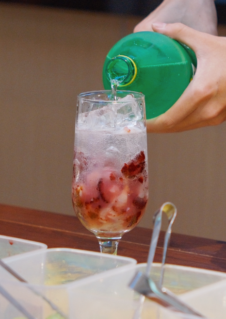 加冰,兑入茉莉冷萃茶和雪碧(可用苏打水+蜂蜜代替)。怕上火可将果肉熬煮10分钟,冷却后进行调制。