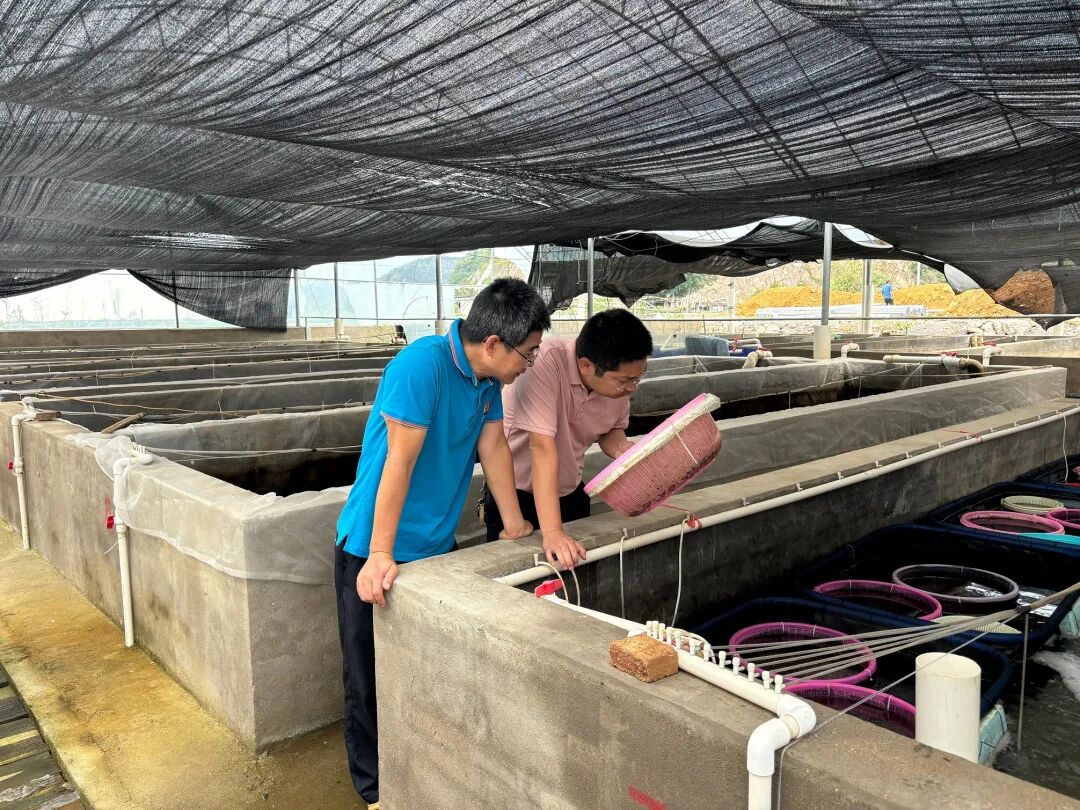 在水产苗种培育基地,陈志观察了中国鲎苗的生长发育状态,并仔细检查、记录了培育环境的温度、湿度、水质等关键环境参数。针对中国鲎不同生长阶段的特殊需求,陈志提出了及时调整温控设备、并制定系统性的“分阶段环境调控”方案等具体指导,为保障中国鲎幼苗的健康成长提供了关键技术支撑。
